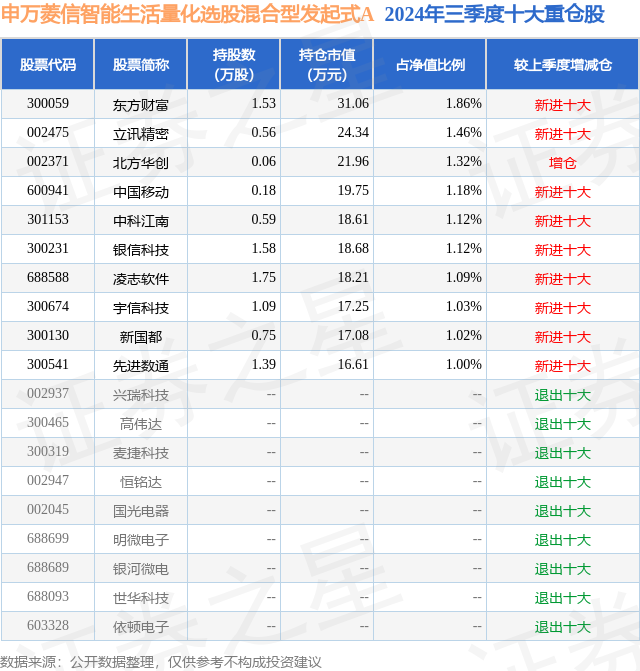 申万菱信智能生活量化选股混合型发起式A的前十大重仓股如下: