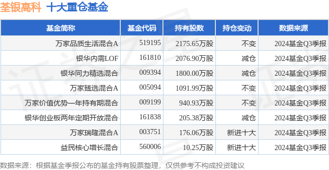 根据2024基金Q3季报公募基金重仓股数据,重仓该股的公募基金共8家,其中持有数量最多的公募基金为万家品质生活混合A。万家品质生活混合A目前规模为32.52亿元,最新净值2.9891(12月26日),较上一交易日上涨1.3%,近一年上涨43.22%。该公募基金现任基金经理为莫海波。莫海波在任的基金产品包括:万家和谐增长混合A,管理时间为2015年5月6日至今,期间收益率为180.43%;万家新兴蓝筹A,管理时间为2016年1月26日至今,期间收益率为308.02%;万家臻选混合A,管理时间为2017年12月20日至今,期间收益率为196.3%。