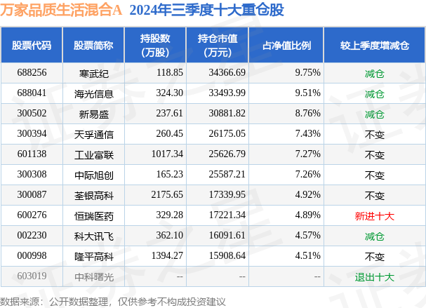 万家品质生活混合A的前十大重仓股如下: