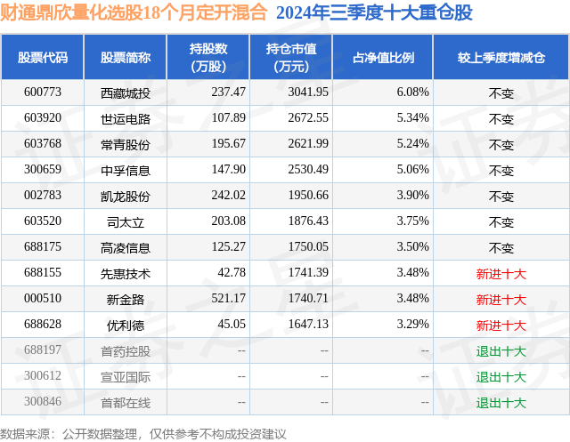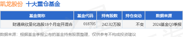 根据2024基金Q3季报公募基金重仓股数据,重仓该股的公募基金共1家,其中持有数量最多的公募基金为财通鼎欣量化选股18个月定开混合。财通鼎欣量化选股18个月定开混合目前规模为5.0亿元,最新净值1.0646(12月20日),较上一交易日下跌0.43%。该公募基金现任基金经理为朱海东 郭欣。朱海东在任的基金产品包括:财通沪深300指数增强,管理时间为2019年7月16日至今,期间收益率为43.15%;财通智选消费股票A,管理时间为2021年1月27日至今,期间收益率为-33.13%;财通中证500指数增强A,管理时间为2023年7月13日至今,期间收益率为-2.06%;财通中证1000指数增强A,管理时间为2023年11月7日至今,期间收益率为2.08%。郭欣在任的基金产品包括:财通沪深300指数增强,管理时间为2024年3月8日至今,期间收益率为10.06%;财通智选消费股票A,管理时间为2024年3月8日至今,期间收益率为3.84%;财通中证500指数增强A,管理时间为2024年3月8日至今,期间收益率为9.25%;