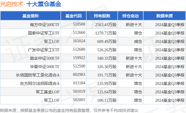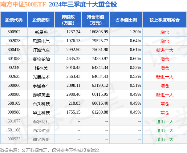 根据2024基金Q3季报公募基金重仓股数据,重仓该股的公募基金共46家,其中持有数量最多的公募基金为南方中证500ETF。南方中证500ETF目前规模为239.13亿元,最新净值5.9803(12月26日),较上一交易日上涨0.8%,近一年上涨13.54%。该公募基金现任基金经理为罗文杰。罗文杰在任的基金产品包括:南方中证500ETF联接(LOF)A,管理时间为2013年4月22日至今,期间收益率为94.35%;南方沪深300ETF,管理时间为2013年5月17日至今,期间收益率为111.49%;南方沪深300ETF联接A,管理时间为2013年5月17日至今,期间收益率为102.26%。