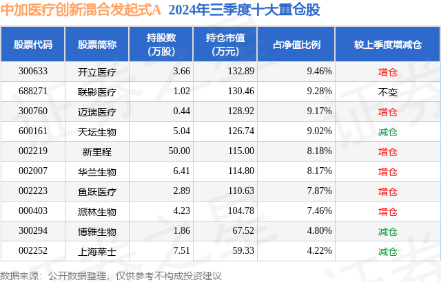 根据2024基金Q3季报公募基金重仓股数据,重仓该股的公募基金共1家,其中持有数量最多的公募基金为中加医疗创新混合发起式A。中加医疗创新混合发起式A目前规模为0.11亿元,最新净值0.7741(12月26日),较上一交易日上涨0.4%,近一年下跌13.6%。该公募基金现任基金经理为薛杨。薛杨在任的基金产品包括:中加龙头精选混合A,管理时间为2023年12月26日至今,期间收益率为17.33%。