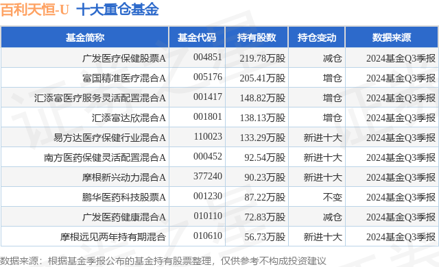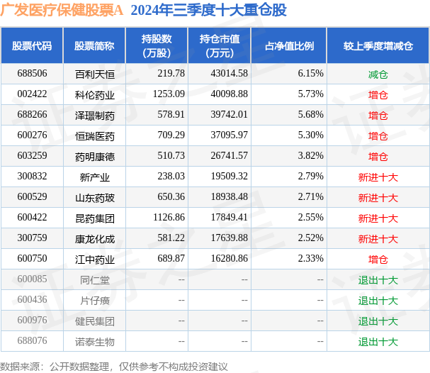 根据2024基金Q3季报公募基金重仓股数据,重仓该股的公募基金共63家,其中持有数量最多的公募基金为广发医疗保健股票A。广发医疗保健股票A目前规模为59.52亿元,最新净值1.6259(12月26日),较上一交易日下跌0.49%,近一年下跌8.6%。该公募基金现任基金经理为吴兴武。吴兴武在任的基金产品包括:广发轮动配置混合,管理时间为2015年2月12日至今,期间收益率为66.33%;广发医药健康混合A,管理时间为2020年10月21日至今,期间收益率为-56.22%;广发创新医疗两年持有混合A,管理时间为2021年3月19日至今,期间收益率为-48.39%。