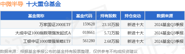 根据2024基金Q3季报公募基金重仓股数据,重仓该股的公募基金共3家,其中持有数量最多的公募基金为万家国证2000ETF。万家国证2000ETF目前规模为12.4亿元,最新净值1.0312(12月26日),较上一交易日上涨1.04%,近一年上涨11.59%。该公募基金现任基金经理为杨坤。杨坤在任的基金产品包括:万家中证红利ETF联接A,管理时间为2019年10月24日至今,期间收益率为66.32%;万家国证2000ETF发起联接A,管理时间为2022年10月11日至今,期间收益率为3.2%;万家中证软件服务ETF发起式联接A,管理时间为2023年3月29日至今,期间收益率为-31.71%。