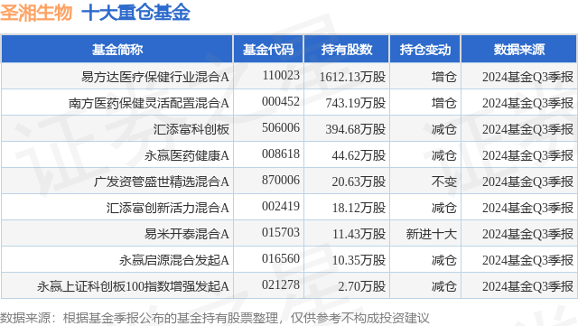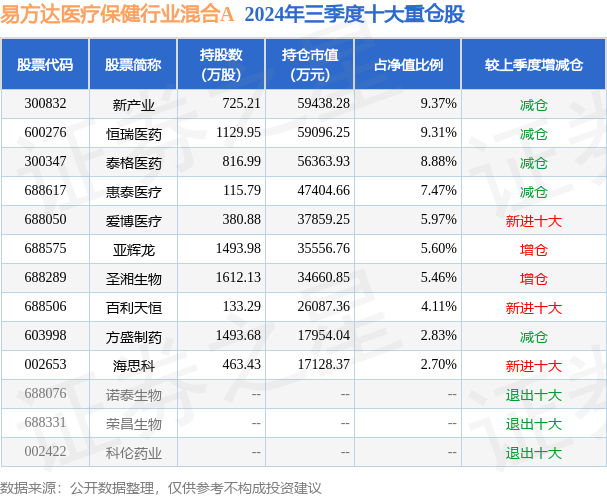 根据2024基金Q3季报公募基金重仓股数据,重仓该股的公募基金共9家,其中持有数量最多的公募基金为易方达医疗保健行业混合A。易方达医疗保健行业混合A目前规模为60.81亿元,最新净值3.066(12月26日),较上一交易日下跌0.2%,近一年下跌6.78%。该公募基金现任基金经理为杨桢霄。杨桢霄在任的基金产品包括:易方达全球医药行业混合发起式(QDII)A(人民币),管理时间为2020年1月20日至今,期间收益率为-27.25%;易方达医药生物股票A,管理时间为2020年11月4日至今,期间收益率为-40.13%。