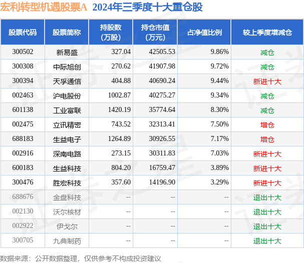 根据2024基金Q3季报公募基金重仓股数据,重仓该股的公募基金共40家,其中持有数量最多的公募基金为宏利转型机遇股票A。宏利转型机遇股票A目前规模为37.25亿元,最新净值2.696(12月26日),较上一交易日上涨7.62%,近一年上涨49.86%。该公募基金现任基金经理为王鹏。王鹏在任的基金产品包括:宏利高研发6个月持有混合A,管理时间为2020年12月28日至今,期间收益率为24.32%;宏利成长混合,管理时间为2020年12月28日至今,期间收益率为20.47%;宏利新兴景气龙头混合A,管理时间为2021年10月25日至今,期间收益率为-31.7%。