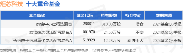 根据2024基金Q3季报公募基金重仓股数据,重仓该股的公募基金共3家,其中持有数量最多的公募基金为泰信中小盘精选混合。泰信中小盘精选混合目前规模为8.43亿元,最新净值3.56(12月26日),较上一交易日上涨5.33%,近一年上涨30.93%。该公募基金现任基金经理为董季周。董季周在任的基金产品包括:泰信鑫选灵活配置混合A,管理时间为2020年11月24日至今,期间收益率为-12.79%。