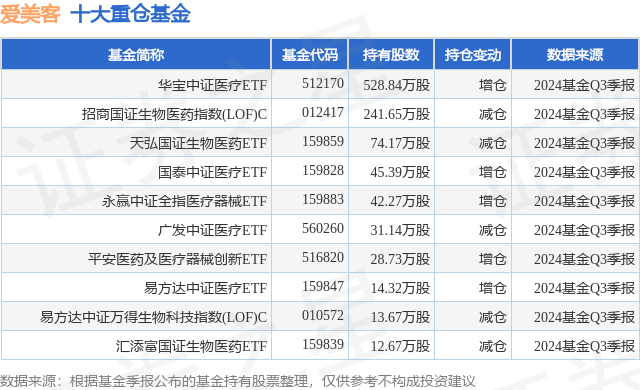 根据2024基金Q3季报公募基金重仓股数据,重仓该股的公募基金共60家,其中持有数量最多的公募基金为华宝中证医疗ETF。华宝中证医疗ETF目前规模为278.81亿元,最新净值0.3339(12月27日),较上一交易日下跌0.06%,近一年下跌12.04%。该公募基金现任基金经理为胡洁。胡洁在任的基金产品包括:华宝中证银行ETF联接A,管理时间为2012年10月16日至今,期间收益率为154.23%;华宝医疗ETF联接A,管理时间为2015年5月21日至今,期间收益率为-62.92%;华宝中证军工ETF,管理时间为2016年8月5日至今,期间收益率为22.93%;华宝中证银行ETF,管理时间为2017年7月18日至今,期间收益率为47.56%。