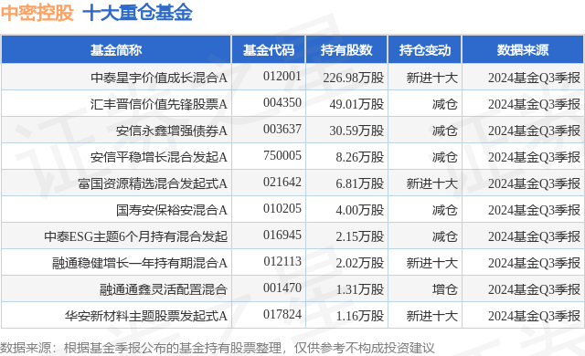 根据2024基金Q3季报公募基金重仓股数据,重仓该股的公募基金共13家,其中持有数量最多的公募基金为中泰星宇价值成长混合A。中泰星宇价值成长混合A目前规模为18.81亿元,最新净值0.7329(12月27日),较上一交易日下跌0.38%,近一年上涨1.09%。该公募基金现任基金经理为田瑀。田瑀在任的基金产品包括:中泰开阳价值优选混合A,管理时间为2019年9月6日至今,期间收益率为67.88%;中泰兴诚价值一年持有混合A,管理时间为2021年2月8日至今,期间收益率为24.52%;