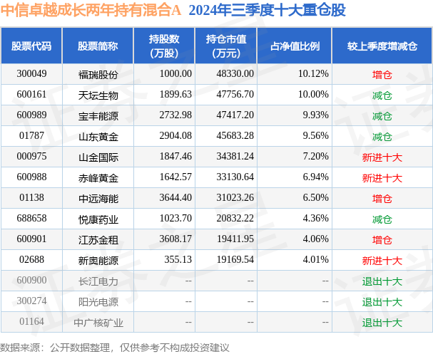 中信卓越成长两年持有混合A的前十大重仓股如下: