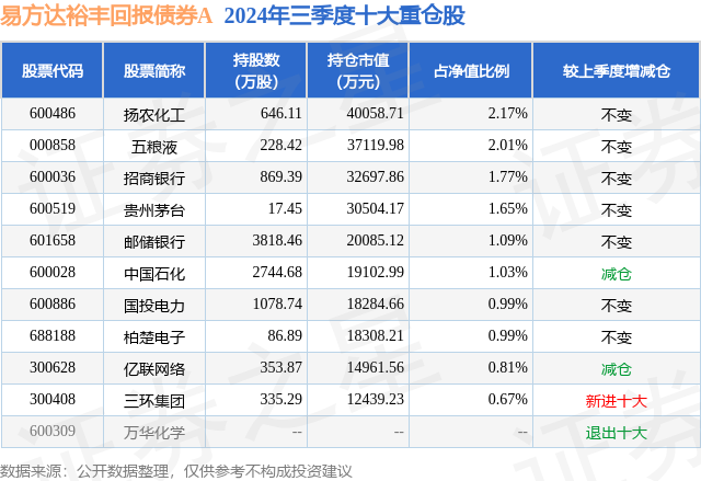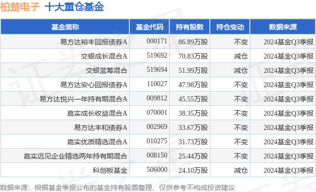 根据2024基金Q3季报公募基金重仓股数据,重仓该股的公募基金共63家,其中持有数量最多的公募基金为易方达裕丰回报债券A。易方达裕丰回报债券A目前规模为178.65亿元,最新净值1.823(12月27日),较上一交易日上涨0.16%,近一年上涨9.49%。该公募基金现任基金经理为张清华 张雅君。张清华在任的基金产品包括:易方达安心回报债券A,管理时间为2013年12月23日至今,期间收益率为243.99%;易方达丰和债券A,管理时间为2016年11月23日至今,期间收益率为52.0%;易方达安盈回报混合A,管理时间为2017年2月16日至今,期间收益率为133.1%。张雅君在任的基金产品包括:易方达招易一年持有期混合A,管理时间为2020年6月30日至今,期间收益率为19.32%;易方达磐恒九个月持有混合A,管理时间为2020年8月7日至今,期间收益率为11.11%;易方达悦通一年持有期混合A,管理时间为2020年12月16日至今,期间收益率为15.09%。