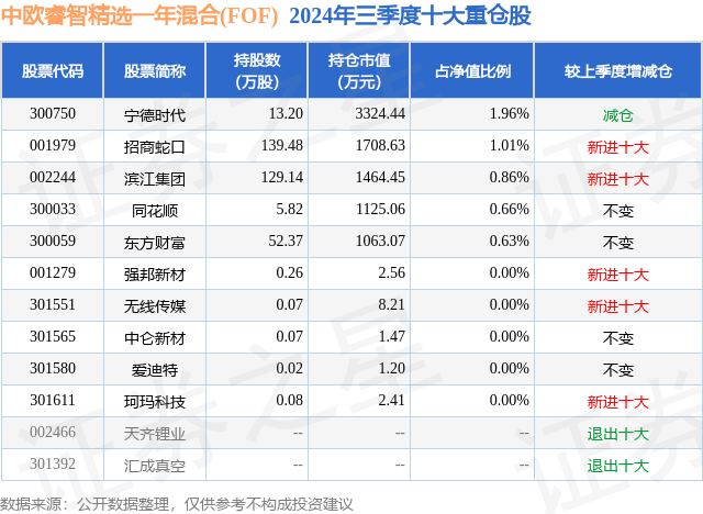 中欧睿智精选一年混合(FOF)的前十大重仓股如下:
