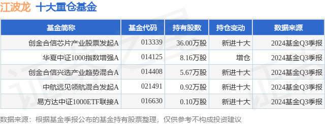 根据2024基金Q3季报公募基金重仓股数据,重仓该股的公募基金共5家,其中持有数量最多的公募基金为创金合信芯片产业股票发起A。创金合信芯片产业股票发起A目前规模为1.9亿元,最新净值1.0207(12月30日),较上一交易日下跌0.24%,近一年上涨28.93%。该公募基金现任基金经理为刘扬。刘扬在任的基金产品包括:创金合信软件产业股票发起A,管理时间为2022年9月29日至今,期间收益率为9.06%;创金合信全球芯片产业股票发起(QDII)A,管理时间为2023年3月24日至今,期间收益率为34.15%。