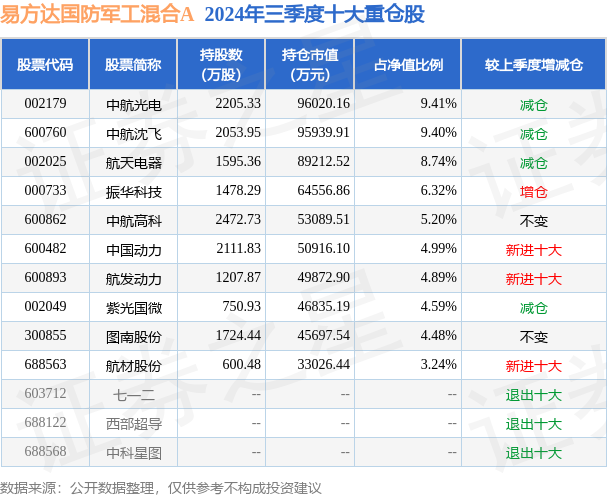 易方达国防军工混合A的前十大重仓股如下: