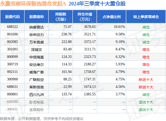 永赢低碳环保智选混合发起A的前十大重仓股如下: