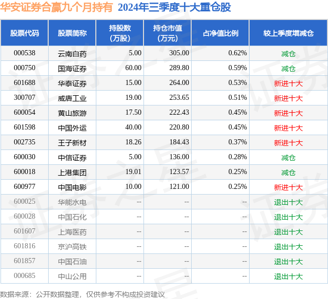 根据2024基金Q3季报公募基金重仓股数据,重仓该股的公募基金共1家,其中持有数量最多的公募基金为华安证券合赢九个月持有。华安证券合赢九个月持有目前规模为4.94亿元,最新净值1.0996(12月30日),较上一交易日上涨0.11%,近一年上涨4.91%。该公募基金现任基金经理为张欣 张钰 刘杰。刘杰在任的基金产品包括:华安证券合赢添利债券,管理时间为2021年9月24日至今,期间收益率为11.47%;华安证券合赢三个月持有债券,管理时间为2021年11月3日至今,期间收益率为12.23%;华安证券睿赢一年持有债券A,管理时间为2021年12月3日至今,期间收益率为17.39%;华安证券汇赢增利一年持有混合A,管理时间为2021年12月7日至今,期间收益率为16.98%。张欣在任的基金产品包括:华安证券合赢三个月定开,管理时间为2021年6月11日至今,期间收益率为15.35%;华安证券合赢添利债券,管理时间为2021年9月24日至今,期间收益率为11.47%;华安证券睿赢一年持有债券A,管理时间为2021年12月3日至今,期间收益率为17.39%。张钰在任的基金产品包括:华安证券合赢三个月定开,管理时间为2021年6月11日至今,期间收益率为15.35%;华安证券合赢六个月持有债券,管理时间为2021年8月16日至今,期间收益率为15.94%;华安证券月月红现金,管理时间为2022年6月27日至今,期间收益率为2.62%。