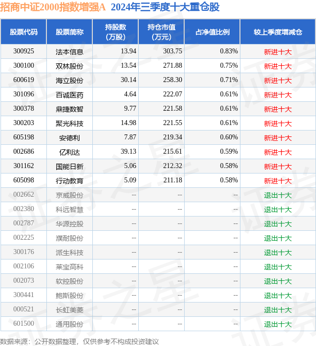 根据2024基金Q3季报公募基金重仓股数据,重仓该股的公募基金共3家,其中持有数量最多的公募基金为招商中证2000指数增强A。招商中证2000指数增强A目前规模为0.72亿元,最新净值1.154(12月31日),较上一交易日下跌2.67%。该公募基金现任基金经理为王平 王岩。王平在任的基金产品包括:招商量化精选股票A,管理时间为2016年3月15日至今,期间收益率为168.28%;招商沪深300指数增强A,管理时间为2017年2月10日至今,期间收益率为53.74%;招商中证红利ETF,管理时间为2019年11月28日至今,期间收益率为95.29%;招商中证光伏产业指数A,管理时间为2021年6月18日至今,期间收益率为-46.98%。王岩在任的基金产品包括:招商沪深300指数增强A,管理时间为2021年3月26日至今,期间收益率为-9.86%;招商沪深300地产等权重指数A,管理时间为2021年7月1日至今,期间收益率为-53.52%;招商中证全指证券公司指数(LOF)C,管理时间为2021年9月13日至今,期间收益率为-6.25%;招商中证500等权重指数增强A,管理时间为2021年9月16日至今,期间收益率为-3.67%。