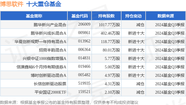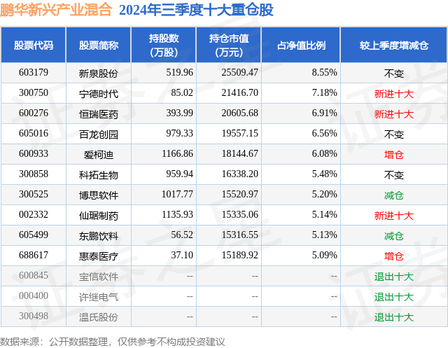 根据2024基金Q3季报公募基金重仓股数据,重仓该股的公募基金共9家,其中持有数量最多的公募基金为鹏华新兴产业混合。鹏华新兴产业混合目前规模为29.83亿元,最新净值2.57(12月31日),较上一交易日下跌1.49%,近一年下跌4.46%。该公募基金现任基金经理为梁浩。梁浩在任的基金产品包括:鹏华新兴成长混合A,管理时间为2020年7月17日至今,期间收益率为-41.27%;鹏华成长智选混合A,管理时间为2020年10月19日至今,期间收益率为-23.21%;鹏华汇智优选混合A,管理时间为2021年1月8日至今,期间收益率为-40.21%。