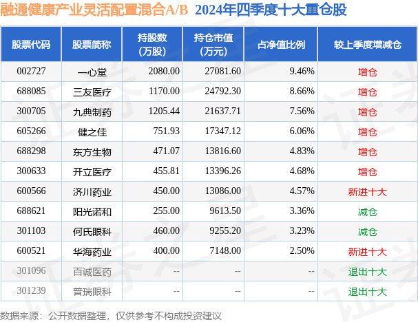 融通健康产业灵活配置混合A/B的前十大重仓股如下: