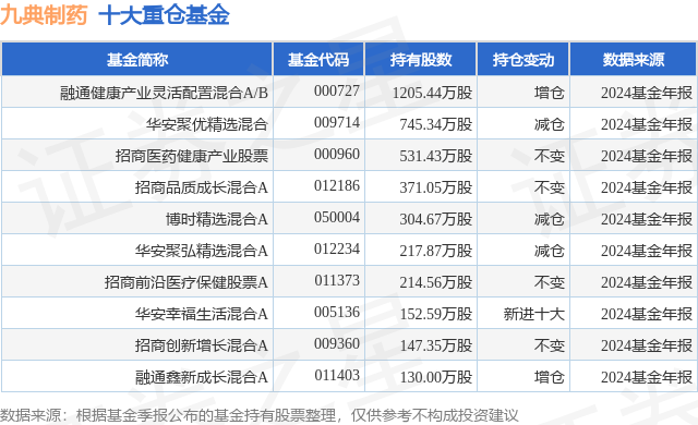 重仓九典制药的前十大公募基金请见下表: