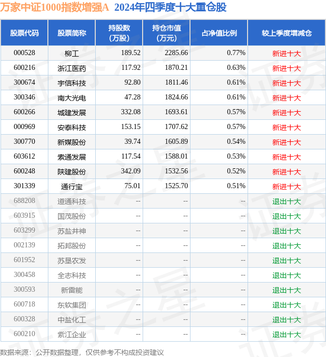 根据2024基金年报公募基金重仓股数据,重仓该股的公募基金共13家,其中持有数量最多的公募基金为万家中证1000指数增强A。万家中证1000指数增强A目前规模为12.38亿元,最新净值1.1651(2月12日),较上一交易日上涨1.01%,近一年上涨26.58%。该公募基金现任基金经理为乔亮。乔亮在任的基金产品包括:万家量化睿选混合A,管理时间为2019年8月21日至今,期间收益率为17.55%;万家沪深300指数增强A,管理时间为2019年9月6日至今,期间收益率为24.16%;万家中证500指数增强A,管理时间为2019年9月6日至今,期间收益率为56.64%。