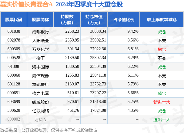 根据2024基金年报公募基金重仓股数据,重仓该股的公募基金共37家,其中持有数量最多的公募基金为嘉实价值长青混合A。嘉实价值长青混合A目前规模为38.26亿元,最新净值0.8577(2月12日),较上一交易日上涨1.13%,近一年上涨15.01%。该公募基金现任基金经理为谭丽。谭丽在任的基金产品包括:嘉实新消费股票,管理时间为2017年4月11日至今,期间收益率为146.99%;嘉实价值精选股票,管理时间为2017年11月6日至今,期间收益率为99.23%;嘉实价值优势混合A,管理时间为2017年11月14日至今,期间收益率为64.0%;嘉实价值发现三个月定开混合,管理时间为2020年9月21日至今,期间收益率为7.24%。