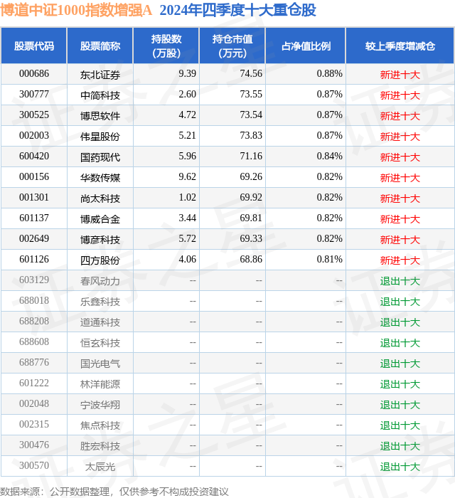 博道中证1000指数增强A的前十大重仓股如下: