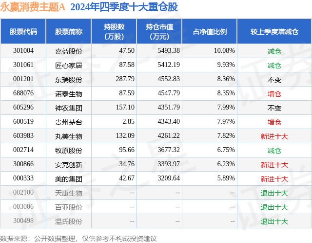 根据2024基金年报公募基金重仓股数据,重仓该股的公募基金共8家,其中持有数量最多的公募基金为永赢消费主题A。永赢消费主题A目前规模为3.45亿元,最新净值1.6076(2月12日),较上一交易日上涨0.56%,近一年下跌2.46%。该公募基金现任基金经理为蒋卫华。蒋卫华在任的基金产品包括:永赢新兴消费智选混合发起A,管理时间为2023年7月31日至今,期间收益率为-1.88%;