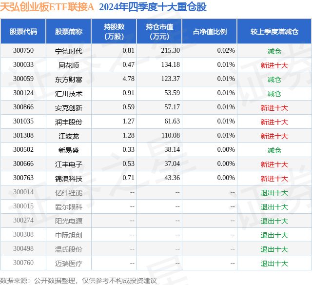 天弘创业板ETF联接A的前十大重仓股如下: