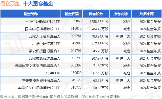 根据2024基金年报公募基金重仓股数据,重仓该股的公募基金共40家,其中持有数量最多的公募基金为华夏中证动漫游戏ETF。华夏中证动漫游戏ETF目前规模为54.14亿元,最新净值1.2441(2月13日),较上一交易日上涨1.07%,近一年上涨40.88%。该公募基金现任基金经理为徐猛。徐猛在任的基金产品包括:华夏恒生ETF联接A,管理时间为2015年12月21日至今,期间收益率为25.53%;华夏恒生ETF(QDII),管理时间为2015年12月21日至今,期间收益率为28.0%;华夏上证50ETF联接A,管理时间为2016年12月1日至今,期间收益率为24.53%;华夏中小企业100ETF,管理时间为2016年12月1日至今,期间收益率为5.29%。