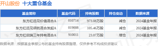 根据2024基金年报公募基金重仓股数据,重仓该股的公募基金共3家,其中持有数量最多的公募基金为东方红远见价值混合A。东方红远见价值混合A目前规模为17.15亿元,最新净值0.9485(2月13日),较上一交易日下跌0.79%,近一年上涨19.71%。该公募基金现任基金经理为周杨。周杨在任的基金产品包括:东方红启瑞三年持有混合A,管理时间为2023年10月28日至今,期间收益率为-2.95%;东方红远见领航混合发起A,管理时间为2023年11月16日至今,期间收益率为-2.68%;东方红远见精选混合A,管理时间为2024年12月6日至今,期间收益率为nan%。