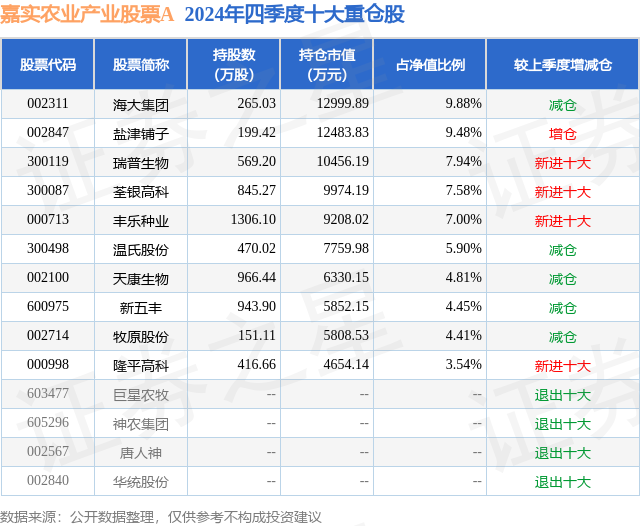 根据2024基金年报公募基金重仓股数据,重仓该股的公募基金共18家,其中持有数量最多的公募基金为嘉实农业产业股票A。嘉实农业产业股票A目前规模为11.12亿元,最新净值1.284(2月13日),较上一交易日上涨0.56%,近一年下跌13.08%。该公募基金现任基金经理为吴越 朱子君。吴越在任的基金产品包括:嘉实消费精选股票A,管理时间为2020年12月9日至今,期间收益率为-30.3%;嘉实新起航混合A,管理时间为2021年10月22日至今,期间收益率为-16.92%;嘉实内需精选混合A,管理时间为2022年1月6日至今,期间收益率为-26.59%。