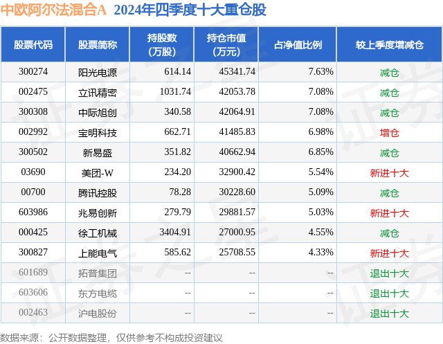 中欧阿尔法混合A的前十大重仓股如下: