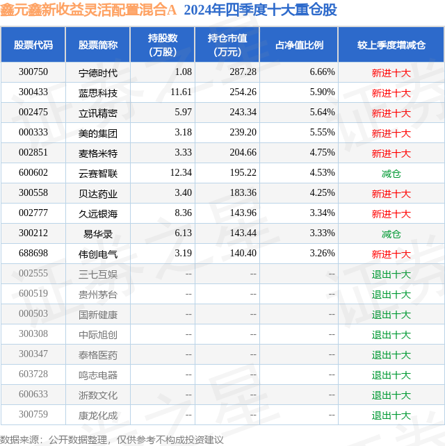 鑫元鑫新收益灵活配置混合A的前十大重仓股如下: