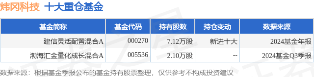 根据2024基金年报公募基金重仓股数据,重仓该股的公募基金共1家,其中持有数量最多的公募基金为建信灵活配置混合A。建信灵活配置混合A目前规模为0.45亿元,最新净值1.1981(2月14日),较上一交易日上涨0.28%,近一年上涨71.87%。该公募基金现任基金经理为叶乐天 郭志腾。叶乐天在任的基金产品包括:建信央视财经50指数(LOF),管理时间为2013年3月28日至今,期间收益率为201.87%;建信中证500指数增强A,管理时间为2014年1月27日至今,期间收益率为162.9%;建信精工制造指数增强,管理时间为2015年8月26日至今,期间收益率为77.79%;建信多因子量化股票,管理时间为2016年8月9日至今,期间收益率为32.03%。郭志腾在任的基金产品包括:建信沪深300红利ETF联接A,管理时间为2023年12月7日至今,期间收益率为24.59%;建信沪深300红利ETF,管理时间为2023年12月7日至今,期间收益率为24.68%。