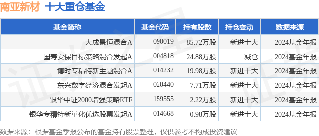 根据2024基金年报公募基金重仓股数据,重仓该股的公募基金共6家,其中持有数量最多的公募基金为大成景恒混合A。大成景恒混合A目前规模为3.03亿元,最新净值2.6234(2月14日),较上一交易日上涨0.67%,近一年上涨54.14%。该公募基金现任基金经理为苏秉毅。苏秉毅在任的基金产品包括:大成核心双动力混合A,管理时间为2016年3月4日至今,期间收益率为65.29%;大成卓享一年持有混合A,管理时间为2023年4月25日至今,期间收益率为4.32%;大成丰享回报混合A,管理时间为2024年1月29日至今,期间收益率为9.44%。