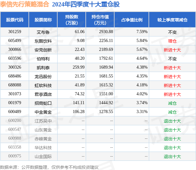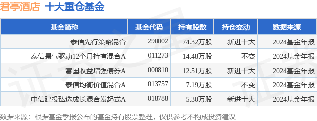 根据2024基金年报公募基金重仓股数据,重仓该股的公募基金共5家,其中持有数量最多的公募基金为泰信先行策略混合。泰信先行策略混合目前规模为3.86亿元,最新净值0.5447(2月17日),较上一交易日上涨0.02%,近一年上涨19.82%。该公募基金现任基金经理为王博强。王博强在任的基金产品包括:泰信景气驱动12个月持有混合A,管理时间为2021年4月8日至今,期间收益率为-38.57%;泰信均衡价值混合A,管理时间为2021年12月22日至今,期间收益率为-31.97%;泰信行业精选混合A,管理时间为2024年5月29日至今,期间收益率为0.0%。