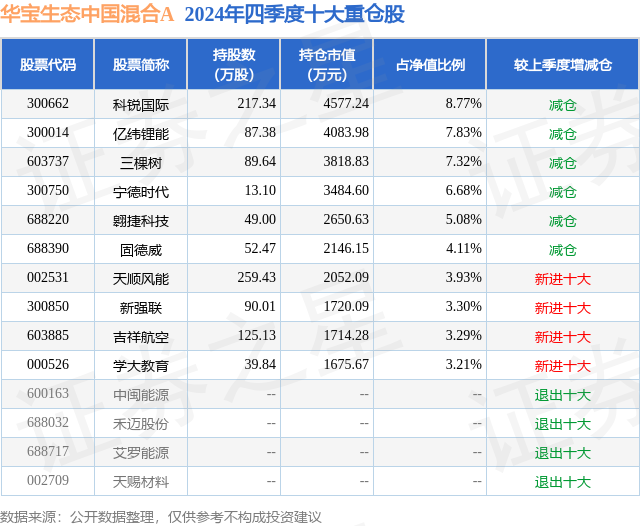 华宝生态中国混合A的前十大重仓股如下: