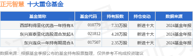 根据2024基金年报公募基金重仓股数据,重仓该股的公募基金共3家,其中持有数量最多的公募基金为西部利得量化优选一年持有A。西部利得量化优选一年持有A目前规模为2.56亿元,最新净值1.0736(2月17日),较上一交易日上涨1.06%,近一年上涨34.25%。该公募基金现任基金经理为翟梓舰。翟梓舰在任的基金产品包括:西部利得中证1000指数增强A,管理时间为2023年10月21日至今,期间收益率为11.09%;西部利得人工智能主题指数增强A,管理时间为2024年11月30日至今,期间收益率为12.23%。