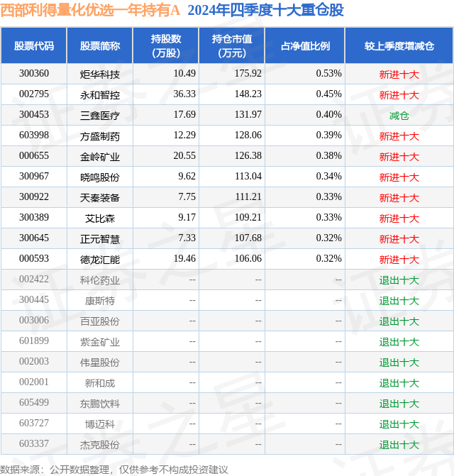 西部利得量化优选一年持有A的前十大重仓股如下:
