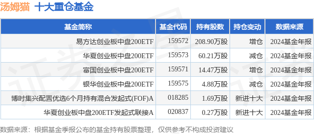 根据2024基金年报公募基金重仓股数据,重仓该股的公募基金共6家,其中持有数量最多的公募基金为易方达创业板中盘200ETF。易方达创业板中盘200ETF目前规模为9.89亿元,最新净值1.2409(2月17日),较上一交易日上涨1.25%,近一年上涨54.24%。该公募基金现任基金经理为李树建。李树建在任的基金产品包括:易方达中证消费50ETF,管理时间为2023年9月9日至今,期间收益率为-1.4%;易方达上证科创板成长ETF联接发起式A,管理时间为2024年1月4日至今,期间收益率为28.44%;易方达中证石化产业ETF联接发起式A,管理时间为2024年1月5日至今,期间收益率为9.0%。