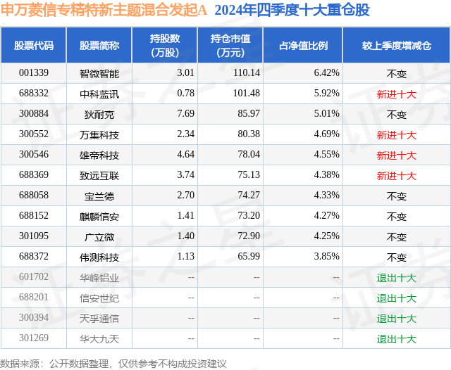 申万菱信专精特新主题混合发起A的前十大重仓股如下: