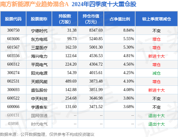 根据2024基金年报公募基金重仓股数据,重仓该股的公募基金共8家,其中持有数量最多的公募基金为南方新能源产业趋势混合A。南方新能源产业趋势混合A目前规模为7.12亿元,最新净值0.6283(2月18日),较上一交易日下跌0.68%,近一年上涨19.02%。该公募基金现任基金经理为熊琳。