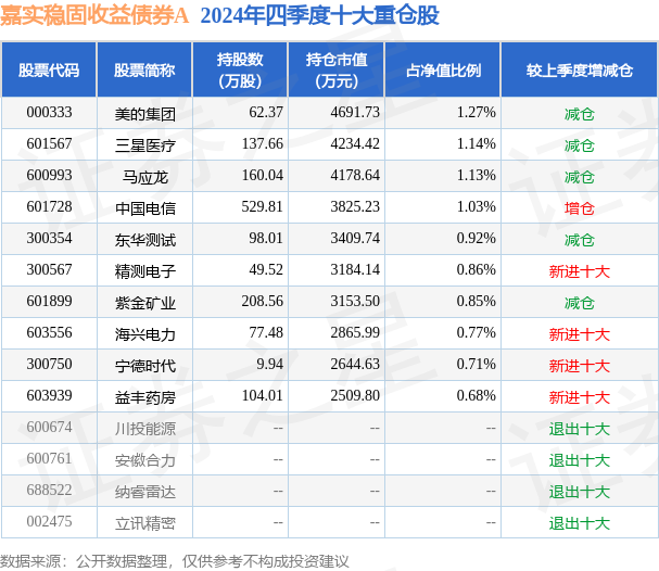 根据2024基金年报公募基金重仓股数据,重仓该股的公募基金共10家,其中持有数量最多的公募基金为嘉实稳固收益债券A。嘉实稳固收益债券A目前规模为26.88亿元,最新净值1.175(2月19日),较上一交易日上涨0.43%,近一年上涨6.18%。该公募基金现任基金经理为胡永青。胡永青在任的基金产品包括:嘉实策略优选混合,管理时间为2016年12月1日至今,期间收益率为69.87%;嘉实浦惠6个月持有期混合A,管理时间为2020年10月14日至今,期间收益率为10.26%;嘉实稳惠6个月持有期混合A,管理时间为2020年11月27日至今,期间收益率为7.54%。