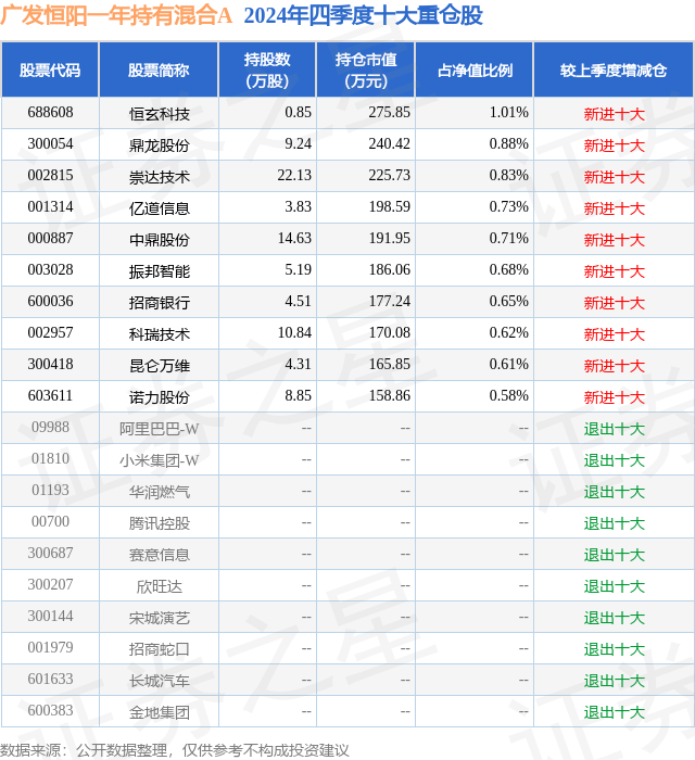 广发恒阳一年持有混合A的前十大重仓股如下: