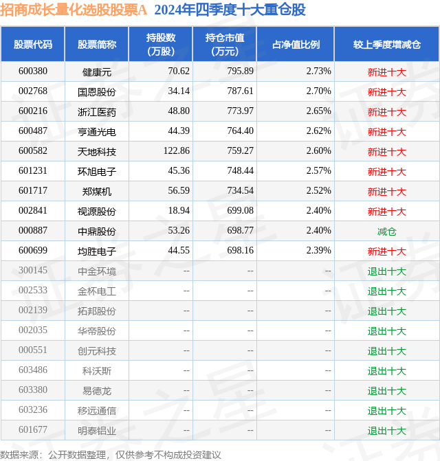 招商成长量化选股股票A的前十大重仓股如下: