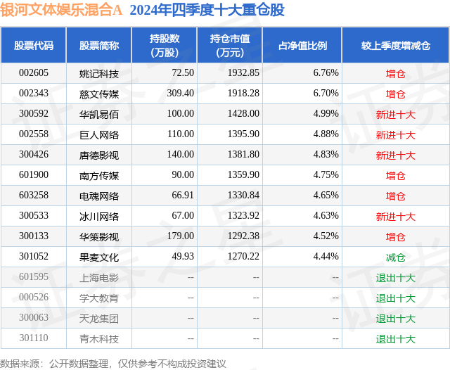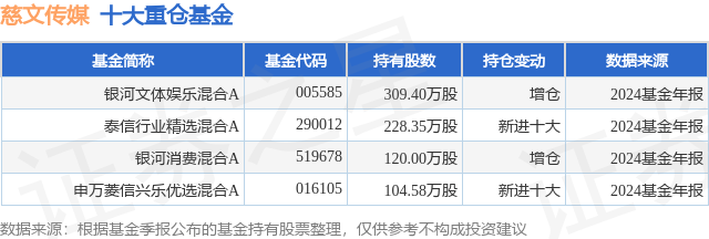 根据2024基金年报公募基金重仓股数据,重仓该股的公募基金共4家,其中持有数量最多的公募基金为银河文体娱乐混合A。银河文体娱乐混合A目前规模为1.67亿元,最新净值1.0877(2月19日),较上一交易日上涨2.91%,近一年上涨10.04%。该公募基金现任基金经理为卢轶乔。卢轶乔在任的基金产品包括:银河消费混合A,管理时间为2012年12月21日至今,期间收益率为76.07%;银河君盛混合A,管理时间为2017年7月12日至今,期间收益率为30.62%;银河中证沪港深高股息A,管理时间为2021年11月5日至今,期间收益率为4.73%。