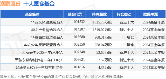 根据2024基金年报公募基金重仓股数据,重仓该股的公募基金共7家,其中持有数量最多的公募基金为华安文体健康混合A。华安文体健康混合A目前规模为20.65亿元,最新净值3.222(2月19日),较上一交易日上涨2.16%,近一年上涨23.12%。该公募基金现任基金经理为刘畅畅 桑翔宇。刘畅畅在任的基金产品包括:华安安华灵活配置混合A,管理时间为2021年8月10日至今,期间收益率为0.98%;华安产业精选混合A,管理时间为2021年12月29日至今,期间收益率为-9.61%;华安品质甄选混合A,管理时间为2022年7月21日至今,期间收益率为-8.48%。桑翔宇在任的基金产品包括:华安医药生物股票发起式A,管理时间为2024年12月25日至今,期间收益率为3.83%。