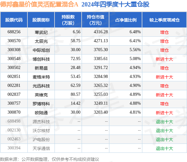 德邦鑫星价值灵活配置混合A的前十大重仓股如下: