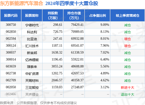 东方新能源汽车混合的前十大重仓股如下: